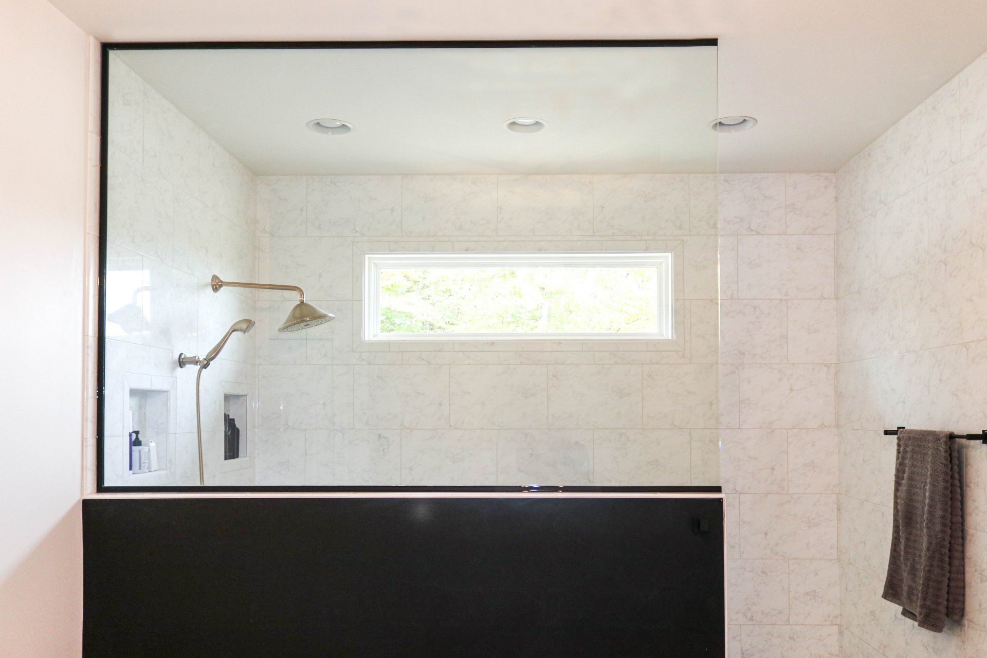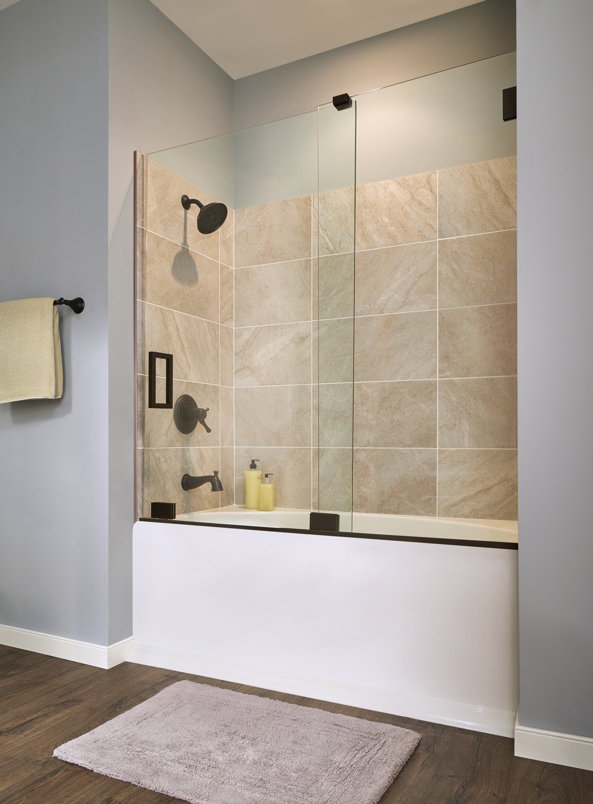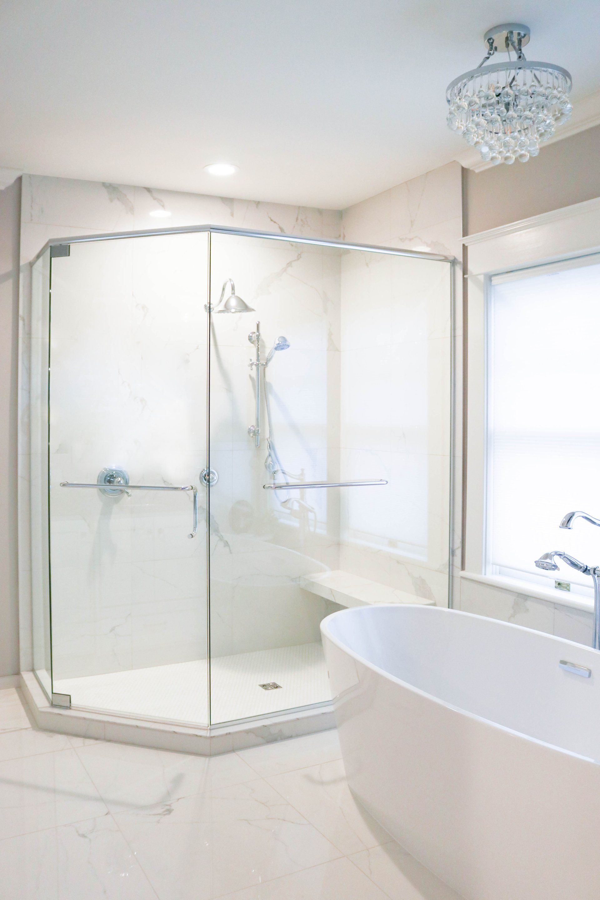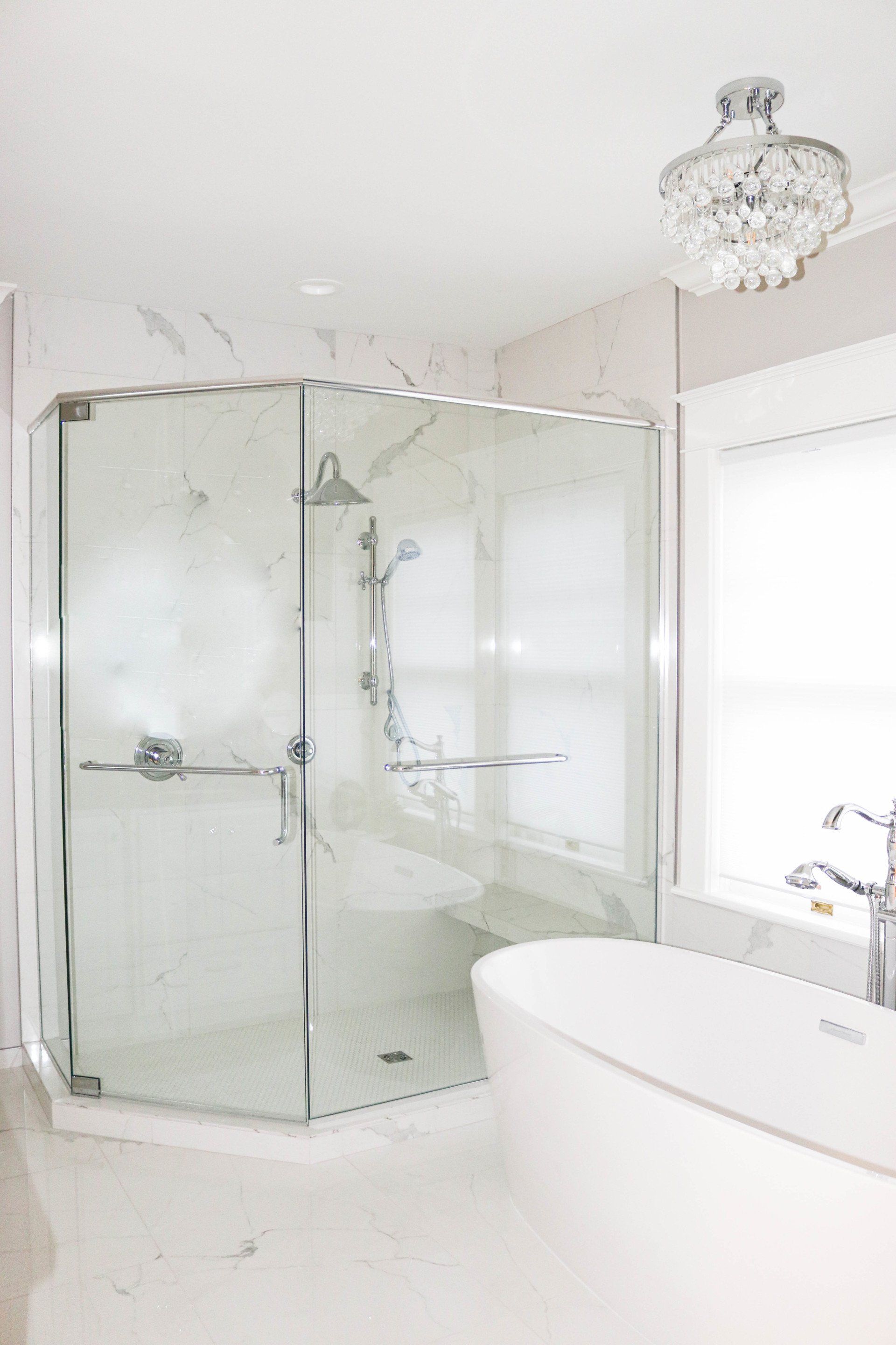 Celesta Floor-to-Ceiling Splash Panels in Clear Glass and Brushed Nickel Hardware.