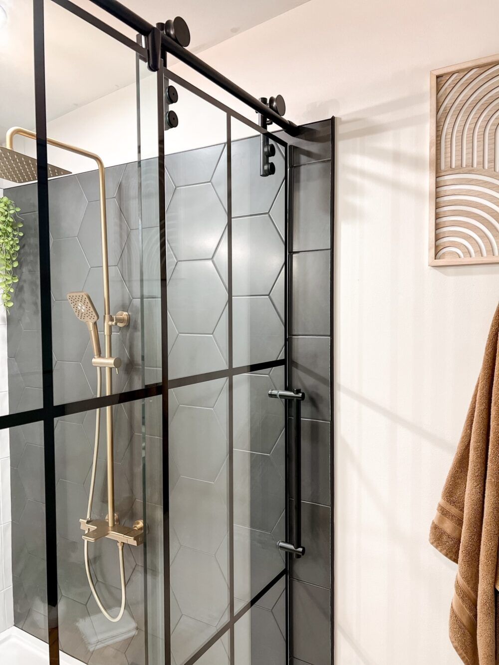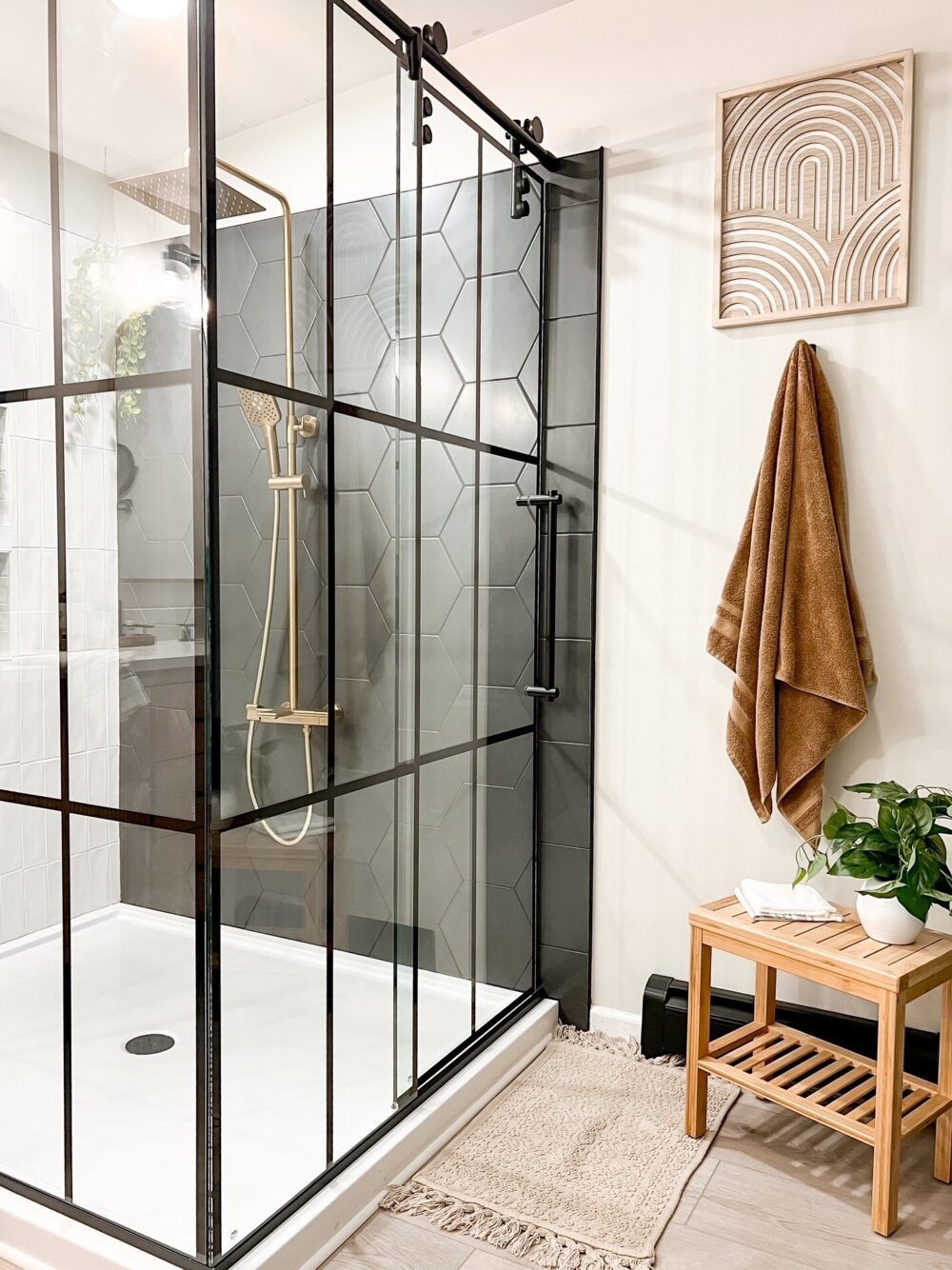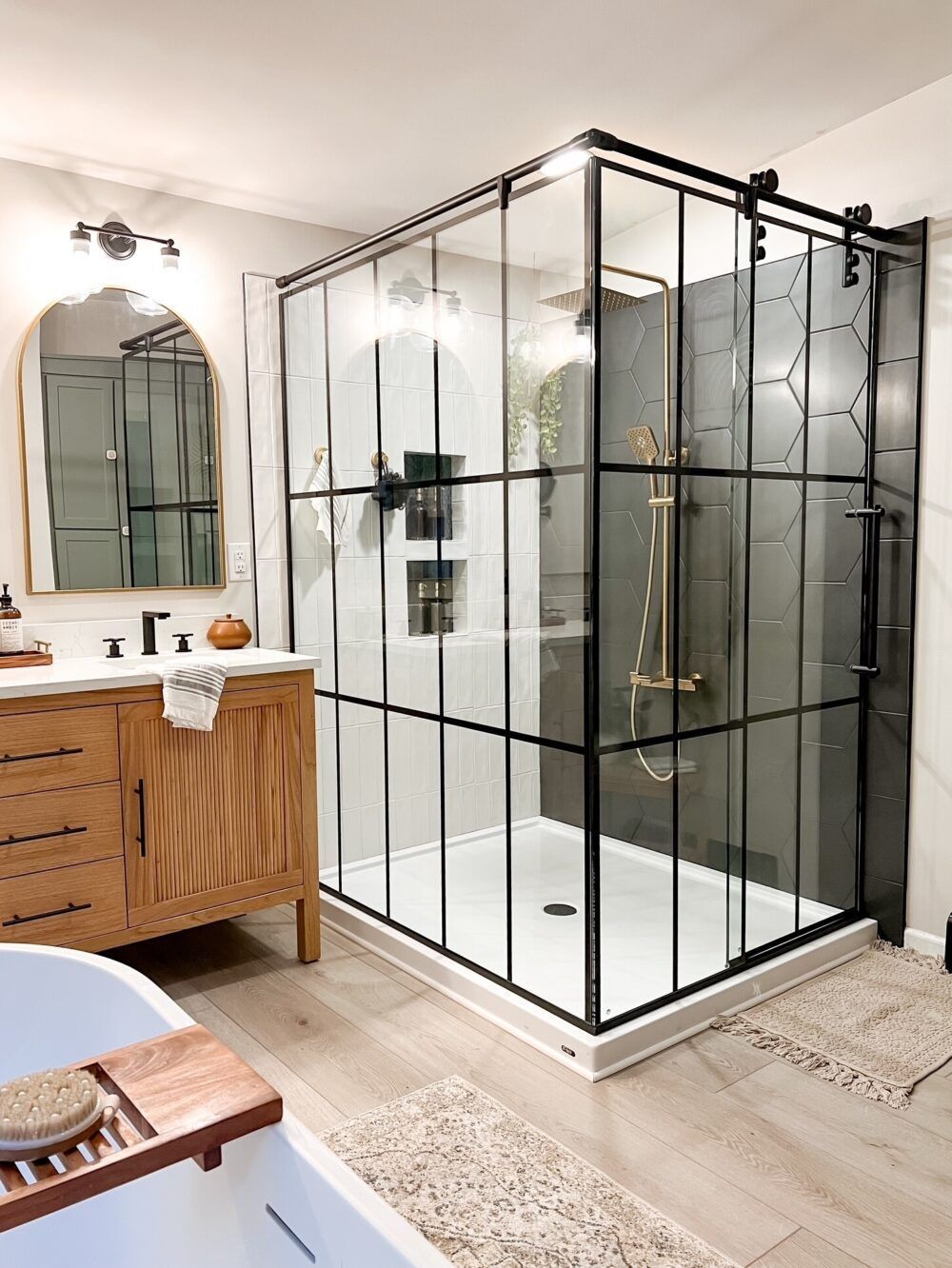 Geolux Panel/Door/Panel/Return Panel Enclosure featuring Clear Glass and Matte Black Hardware.
